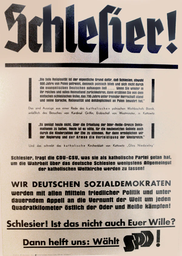 Соцал-демократическая партия Германии (СДПГ) во главе Курта Шумахера, активно агитировали за единую, демократическую, социалистическую Германию. При этом, Курт Шумахер активно выступал простив слияния с КПГ и СЕПГ, а также стремился дистанцировать свою партию от макрсизма и ленинизма. Особое место в предвыборной агитации занимала критика ХДС/ХСС о том, что они, как и их председатель Конрад Аденауэр, предали национальные интересы государства[4], кульминацией чего стал выкрик Шумахера на сессии бундестага 25 сентября 1949 года с открытым обвинением в том, что Конрад Аденауэр лишь марионетка оккупационных стран: «Канцлер союзников!»[5].