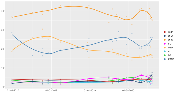 | Июль 2017 | CeDem Архивная копия от 13 сентября 2020 на Wayback Machine | 39 | 11,6 | — | 4,9 | — | 4 | 5,9 | 19,9 | 3,9 | 3,2 | 3,1 | 1,2 | 1,1 | 3,7 | 19,1 |