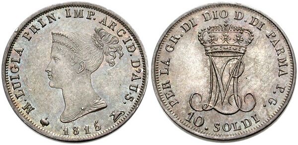 В 1815 году были введены в обращение серебряные монеты достоинством в 5 и 10 сольдо, а также в 1, 2 и 5 лир, и золотые монеты достоинством в 20 и 40 лир. В 1830 году были введены в обращение медные монеты достоинством в 1, 3 и 5 чентезимо. Вплоть до смерти Марии-Луизы все монеты чеканились в австрийском Милане.