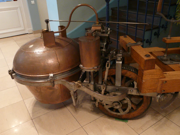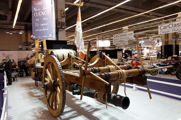 В 1769 году французский изобретатель Кюньо испытал первый образец машины с паровым двигателем[1], известный как «малая телега Кюньо» (первый прошедший испытания образец выставлен в музее в Париже), а в 1770 году — «большую телегу Кюньо». Сам изобретатель назвал её «Огненная телега» — она предназначалась для буксировки артиллерийских орудий.
