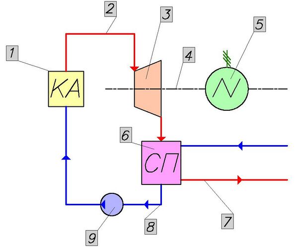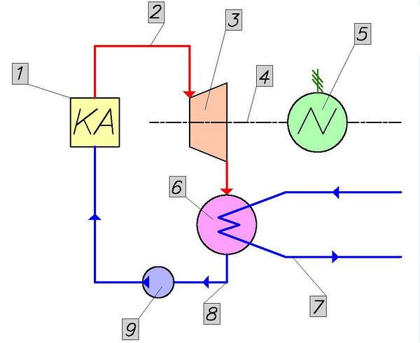 Схема работы теплофикационной турбины: Свежий (острый) пар из котельного агрегата (1) по паропроводу (2) направляется на рабочие лопатки цилиндра высокого давления (ЦВД) паровой турбины (3). При расширении, кинетическая энергия пара преобразуется в механическую энергию вращения ротора турбины, который соединён с валом (4) электрического генератора (5). В процессе расширения пара из цилиндров среднего давления производятся теплофикационные отборы и из них пар направляется в подогреватели (6) сетевой воды (7). Отработанный пар из последней ступени попадает в конденсатор, где и происходит его конденсация, а затем по трубопроводу (8) направляется обратно в котельный агрегат при помощи насоса (9). Бо́льшая часть тепла, полученного в котле используется для подогрева сетевой воды.