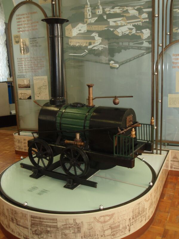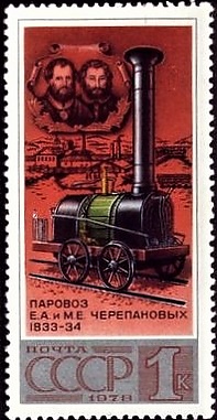 Первый паровоз был построен Ефимом и Мироном, отцом и сыном Черепановыми в 1833 году на Выйском заводе, входившем в состав Нижнетагильских заводов. Испытания паровоза начались в августе 1834 года. Чертёж этого паровоза, выполненный Амосом Черепановым был представлен в рапортах управляющего Нижнетагильской Заводской конторой Дмитрия Белова в Санкт-Петербургскую контору Демидовых о заводском производстве за 1834 год[1].