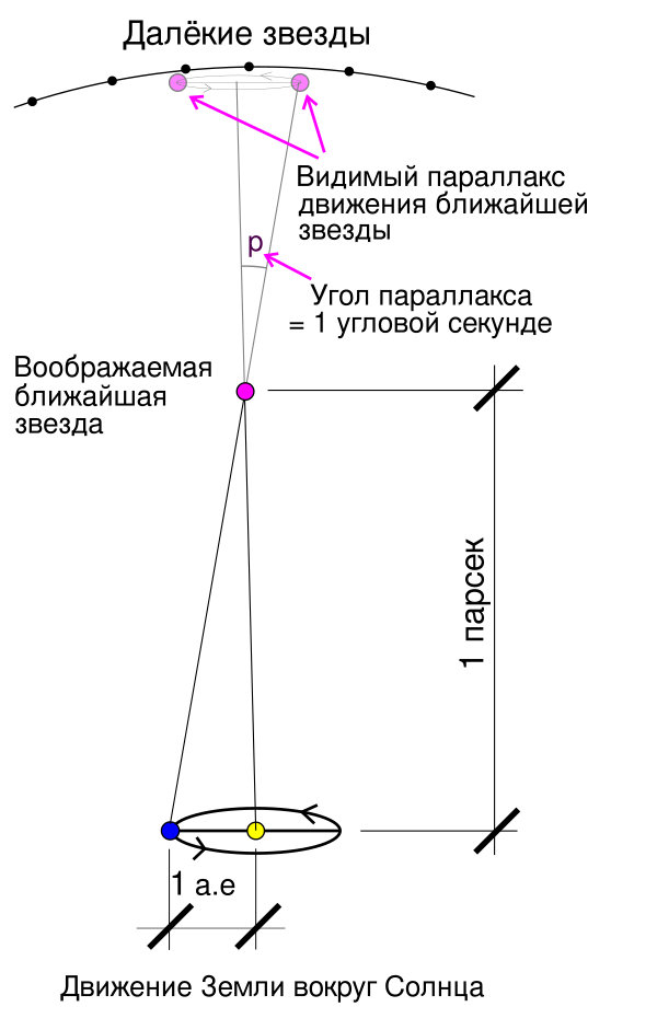 Связь между расстоянием до астрономического объекта в парсеках и его годичным тригонометрическим параллаксом , выраженным в угловых секундах, определяется формулой[1]:
