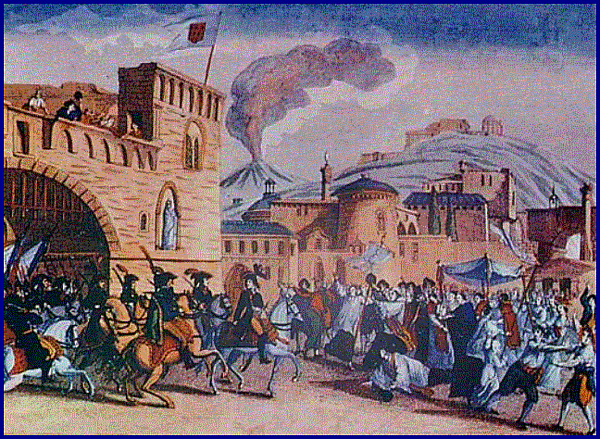 В городе начались беспорядки, и лаццарони начали убивать лиц, подозреваемых в республиканских симпатиях. В этих условиях, брошенная своим королём аристократия, чтобы избежать анархии, начала задумываться о провозглашении республики под французским протекторатом. 12 января 1799 года Пиньятелли подписал в Спаранизе капитуляцию перед генералом Ж. Шампионне. Когда новость о капитуляции перед французами достигла Неаполя и провинций, лаццарони восстали. Несмотря на плохое вооружение и низкую дисциплину, они оказывали ожесточённое сопротивление. Одновременно с ними за оружие взялись и неаполитанские республиканцы. 20 января 1799 года республиканцы заняли крепость Сант-Эльмо и французы смогли войти в город. 23 января 1799 года французская армия под командованием генерала Шампионне вошла в Неаполь. В этом конфликте потери составили: 8000 неаполитанцев и 1000 французов.