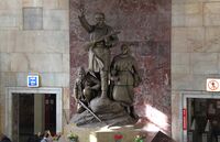 У станции один выход в западном торце. Две лестницы соединяют обе платформы с подземным кассовым вестибюлем. На промежуточной площадке выходных лестниц рядом с мостиком над средним путём расположена скульптурная группа «Партизаны» (в центре Павел Елисеевич Кривоносов, справа Тося Петрова) (скульптор М. Г. Манизер)[13]. Две длинные лестницы — одна на спуск, другая на подъём — соединяют подземный вестибюль с поверхностью. Наземный павильон представляет собой массивное прямоугольное строение с фасадом, украшенным глубоким портиком с колоннами чёрного диабаза. Изнутри стены облицованы белым и красным мрамором[14].