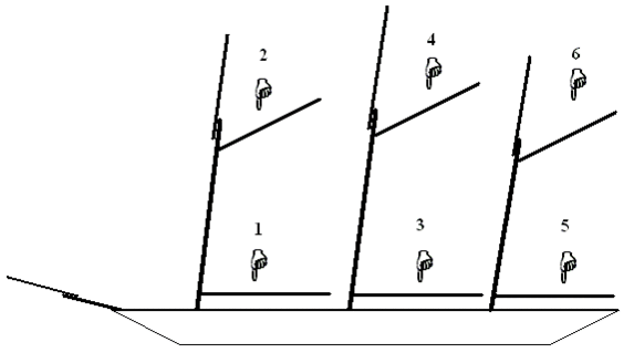 - Гафельное с косыми парусами: главным — между гафелем и гиком и верхним — между гафелем и стеньгой; верхний парус может быть заменён одним или несколькими прямыми, меньших размеров.