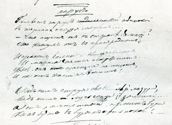 Фраза «Белеет парус одинокой» появилась в литературе за несколько лет до написания стихотворения: читатели впервые встретились с ней в 1828 году, когда была опубликована поэма «Андрей, князь Переяславский» А. А. Бестужева-Марлинского[7].