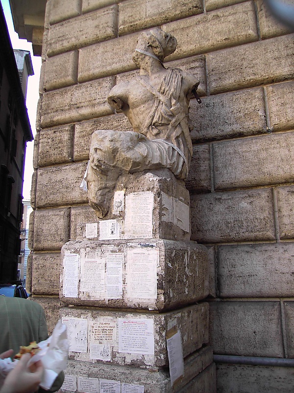 Статуя утратила свою функцию украшения города, когда для горожан стало привычкой и обычаем приклеивать на её пьедестал свои сатирические поэмы на римском диалекте. Это были сатиры, карикатуры, анекдоты, сплетни, клевета. В них критиковался папа или члены правительства. Их стали звать pasquinades. Они наклеивались ночами, и утром римский народ успевал их прочесть, прежде чем их ликвидировали карабинеры.