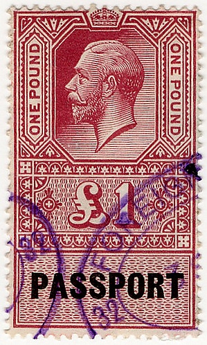Британские паспортные марки выпускались в первой половине XX века, во времена царствования Георга V (1910—1936). На марках присутствует портрет короля, указана стоимость (1 фунт стерлингов), и внизу чёрным цветом отпечатана надпись англ. «PASSPORT» («Паспорт»).