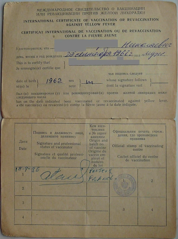 В ряде стран могут быть и национальные формы документа. Так, в России существует «Сертификат о профилактических прививках» (форма № 156/у-93) в виде небольшой брошюрки, утверждённый приказом Минздрава РФ от 17.09.1993 № 220 «О мерах по развитию и совершенствованию инфекционной службы в Российской Федерации»[6][7]. Предусмотрен статьями 1 и 17 федерального закона от 17.09.1998 г. № 157-ФЗ «Об иммунопрофилактике инфекционных болезней»[8]. В свидетельство о профилактических прививках, в частности дублируется информация о проведённой вакцинации из карты профилактических прививок (форма 063-у) заполняемой и хранимой в медицинской организации по месту территориального обслуживания (проведения вакцинации)[9]. Свидетельство служит для удостоверения о проведённой иммунизации граждан в сторонних организациях в случаях, когда это необходимо (при отсутствии свидетельства у гражданина, в каждом случае может потребоваться получение справки из медицинской организации).