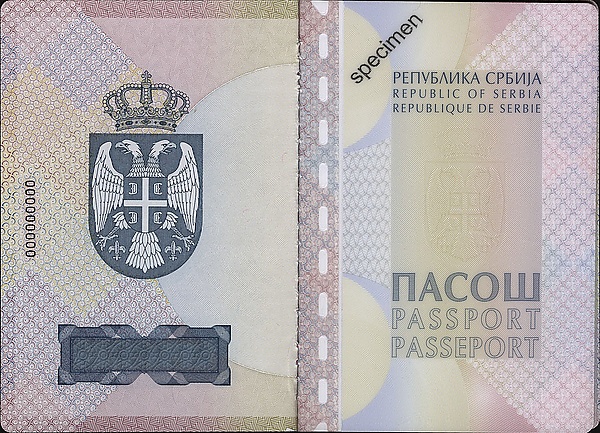На обратной стороне лицевой обложки располагается герб Сербии, первая страница содержит название страны и слово паспорт на трёх языках — сербском (в кириллическом написании), английском и французском.