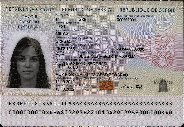 Информационная страница напечатана на сербском (кириллическое написание), английском и французском языках, в то время как персональные данные указаны на сербском (латинское написание).