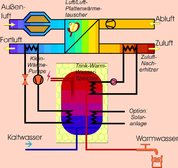 Интересную схему оборудования пассивного дома предложили в мае 1988 года доктор Вольфганг Файст, основатель «Института пассивного дома» в Дармштадтe (Германия), и профессор Бу Адамсон из Лундского университета (Швеция). Концепция разрабатывалась в многочисленных исследовательских проектах, финансируемых землёй Гессен, Германия.