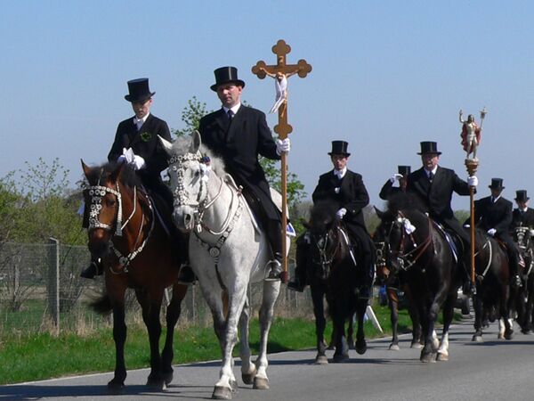 Впервые о пасхальном конном шествии было упомянуто в 1541 году. Оно проходило между городком Виттихенау и деревней Ральбиц. Своими корнями обряд уходит в дохристианское время к древней традиции местного крестьянского населения ранней весной объезжать на лошадях вокруг своих наделов земли, совершая тем самым ритуал изгнания с полей злых духов зимы. Как и многие другие обряды, этот обряд с течением времени приобрёл новое значение, но и в начале XXI века можно наблюдать картину, к примеру, в районе Остро, когда рано утром, ещё до начала традиционного конного шествия, местные мужчины в одиночку на лошадях объезжают вокруг своих полей. Одновременно в пути может находиться несколько процессий. Количество участников пасхальных процессий с течением времени значительно колебалось, так в 1974 году в шествиях принимало участие 487 всадников, а к 2007 году их количество было уже около 1700.