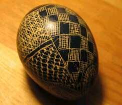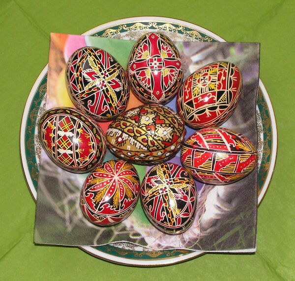 - «Писанки» считались самыми нарядными, обычно в процессе их изготовления были задействованы все члены семьи. Узор наносили на скорлупу тонким крючком, сделанным из проволоки, предварительно окунув его в расплавленный воск, а потом опускали яйца в краску. В тех местах, где восковая полоска оставила след, яйцо не окрашивалось, и получался красивый узор[20].