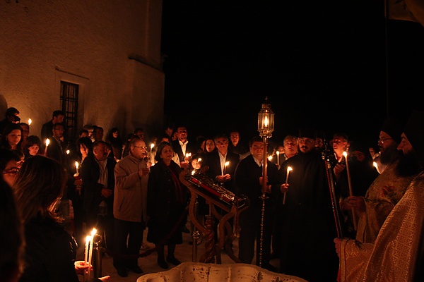 Специальным авиарейсом в Великую Субботу доставляют из Храма Гроба Господня в Иерусалиме Благодатный огонь, который торжественно встречают с почётным караулом и провозят по улицам столицы Греции города Афины к Кафедрального собора Благовещения Пресвятой Богородицы, откуда его развозят по всей стране, вплоть до самых отдалённых греческих островов. Вечером Великой Субботы совершается торжественная Пасхальная служба, во время которой в полной темноте все зажигают свои свечи от единственной горящей свечи и разносят огонь по всему храму.