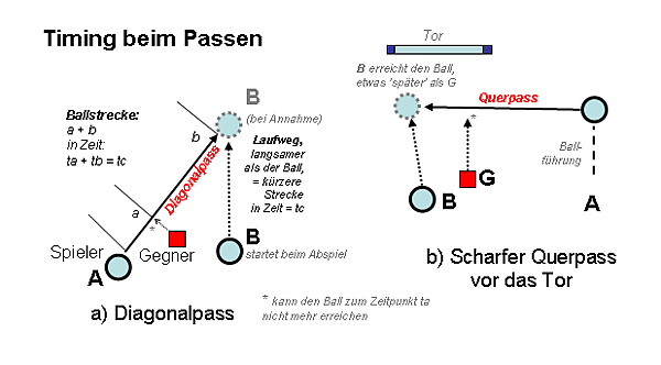 Для пасовой игры, помимо точности передачи, крайне важен тайминг. Особенно пасующий должен учитывать несколько факторов: исходя из своей и текущей позиции адресата, а также возможных соперников и их потенциальных траекторий движения, он должен выбрать правильный момент и угол передачи (включая возможный эффект), а также сыграть мяч подходящей техникой и силой удара (определяет скорость мяча) так, чтобы тот достиг партнёра в нужный момент (или наоборот). Дополнительные факторы — состояние поля[1] (влажность, ровность и глубина, высота травы и т. д.), погодные условия, скорость игроков и соперников, возможные положения вне игры и др. Опытные игроки интуитивно владеют этим и заранее распознают возникающие возможности для паса.