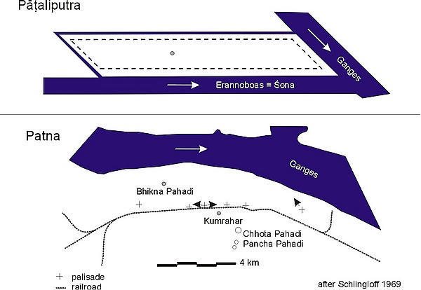 Древняя Патна, носившая название Паталипутра (санскр. पाटलिपुत्र, IAST: Pāṭaliputra, пали Pātaliputtā), столица империй Нандов, Маурьев, Шунгов и Гупта, была величественным городом и чудом того времени. Она была расположена у места слияния Ганга с Соном.