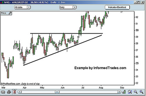 - Треугольник — паттерн продолжения. Различают восходящие (направлены в сторону, максимумы цен находятся на одном уровне, минимумы повышаются), нисходящие (противоположен восходящему) и симметричные треугольники (формируется как паттерн консолидации, когда широкий диапазон цен постепенно сокращается сверху и снизу под давлением покупателей и продавцов).