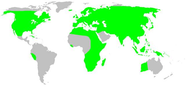 Населяют всю, кроме крайнего севера, территорию Северной Америки, Евразии и Полинезии, а также населяют Эквадор и Перу в Южной Америке, везде в Африке исключая территорию джунглей и юго запада Сахары, в Австралии населяют запад.