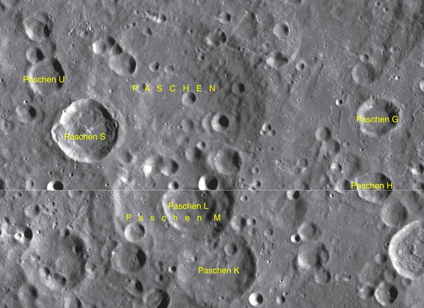 - Образование сателлитного кратера Пашен M относится к нектарскому периоду[1].