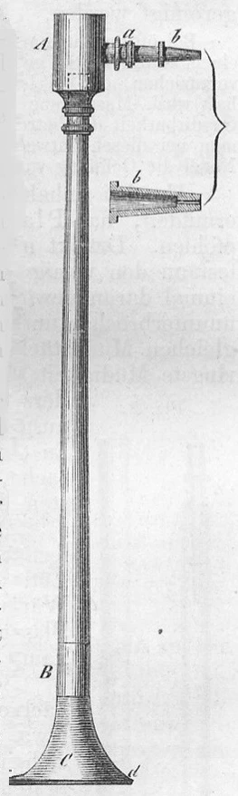 Форма её постепенно менялась и к началу XX века она имела вид, представленный на рисунке справа, где B — это (вертикальная на рисунке) коническая трубка из латуни или нейзильбера около 200 мм длиной и C (внизу) — роговой мундштук. На трубку надевается полый цилиндр A (вверху) высотой около 20 мм, предназначенный для удаления влаги из вдуваемого воздуха, его в конце XVIII века изобрёл Ган, ученик Бергмана. В цилиндр сбоку вставлена трубочка a, снабженная платиновым наконечником b. Диаметр отверстия в наконечнике около 0,4—0,5 мм.