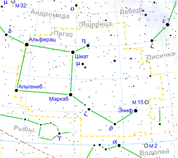 - M15 — крупное шаровое скопление около «головы» (ε Peg, Эниф) Пегаса.