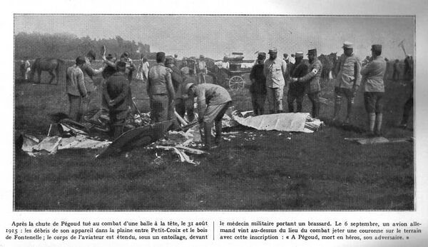 Самолёт Пегу был сбит немецким капралом[9]. Им оказался его ученик польского происхождения Отто Кандульски (нем. Kandulski). 6 сентября, узнав о гибели героя, лётчик Кандульски и его наблюдатель лейтенант фон Билиц (нем. von Bilitz) вернулись на место боя и сбросили над французскими позициями траурный лавровый венок с надписью на ленте: "Пегу, геройски погибшему за свою Родину, от противника".
