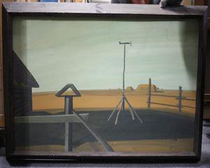 Горизонтально ориентированное изображение выполнено в плоскостной и схематичной манере. На первом плане слева представлен угол ограды, сколоченной из жердей, с треугольной верхушкой на угловом столбике. Во втором плане слева расположен угол деревянного низкого строения без окон. В центре композиции выделяется флюгер в виде самолёта, установленный на высокой вертикальной жерди с опорами, образующими рёбра правильной пирамиды. Справа изображена ещё одна ограда из жердей. На дальнем плане видны поля с большими стогами сена справа, уходящие к линии горизонта. Небо занимает значительную часть полотна и выполнено в высоких голубых тонах. Для работы характерна преобладающая цветовая гамма, включающая жёлтые, голубые, серые и коричневые оттенки.