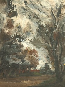 В центре композиции выделяется дерево с плавно изогнутым стволом и наклонёнными влево ветвями, расположенное на первом плане справа. Правее изображены два тонких изогнутых ствола. Левую часть полотна занимает крупное дерево с пышной кроной, за которым по диагонали размещены несколько меньших деревьев. На заднем плане виден силуэт небольшого домика.