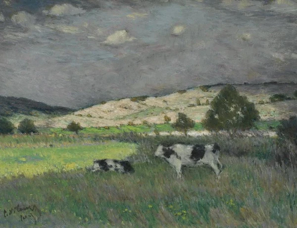 На переднем плане картины изображён зелёный луг, по которому пасутся две чёрно-белые коровы. Левая часть луга освещена солнечным светом, подчёркивая разнообразие оттенков зелёного. Вдали виднеются холмы и деревья, а над пейзажем простирается синее небо с облаками.