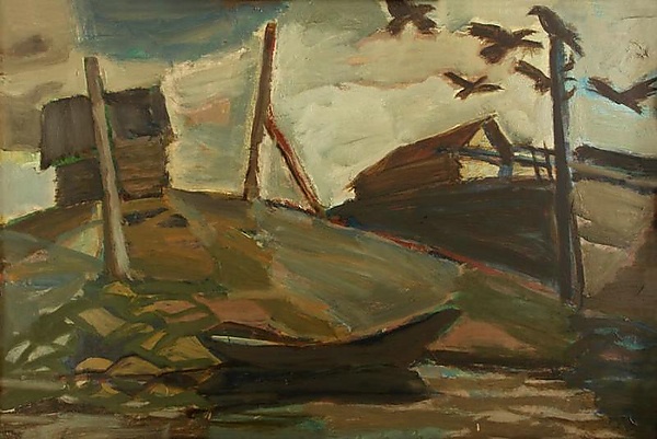 На картине представлен пейзаж с водной поверхностью на переднем плане, в центре которой находится лодка. На втором плане изображены два холма с деревянными постройками и столбами. В правом верхнем углу полотна видна стая ворон.