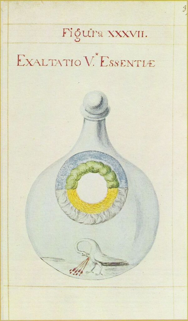 Пеликан, кроме того, является важнейшим алхимическим символом — отчасти из-за уже упоминавшейся легенды, отчасти из-за сходства его клюва по форме с ретортой (которую иногда именовали «философским пеликаном»).
