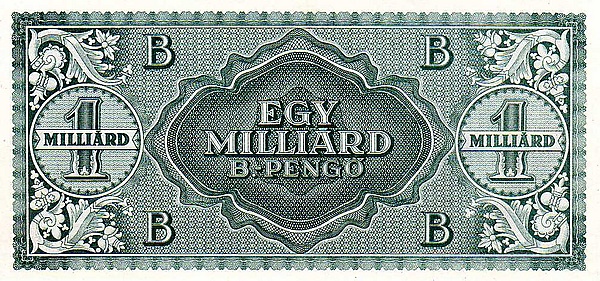 В ходе очередной «деноминации» милпенгё был признан слишком мелкой платёжной единицей, вследствие чего возникло понятие Б.-пенгё (биллио пенгё), означающее биллион (в российской математике это соответствует триллиону) пенгё или миллион милпенгё. Быстро появились и так же быстро обесценились купюры достоинством в 10 000, 100 000, 1 миллион, 10 миллионов и 100 миллионов Б.-пенгё. К выпуску была подготовлена и крупнейшая в мире, миллиардная купюра (номиналом в секстиллион пенгё), но в оборот её так и не выпустили. Хотя к тому времени адопенгё уже совершенно обесценилась, уровень инфляции по ней всё же был значительно меньше, и адопенгё был выведен из чисто внутрибанковского оборота в общий с июля 1946 года. Соответственно, новые появляющиеся купюры номинировались уже в адопенгё — достоинством в 50 000, 100 000, 500 000, 1 миллион и 10 миллионов адопенгё. Эта последняя купюра, по курсу на 31 июля, соответствовала гигантскому числу в 20 октиллионов (2 × 1028) пенгё, но при этом она стоила всего 4,35 американского цента.