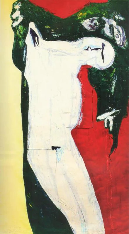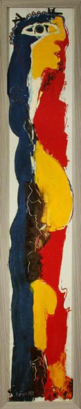 Композиция представляет собой схематичный женский портрет в полный рост, исполненный в профиль. На уровне виска белым контуром выделен утрированный глаз непропорционально большого размера. Над ним проходит волнистая линия, обозначающая прядь волос, которая продолжается извилистой полосой вдоль спины до пят. Туловище сформировано из чередующихся фрагментов различной формы жёлтого и красного цвета.