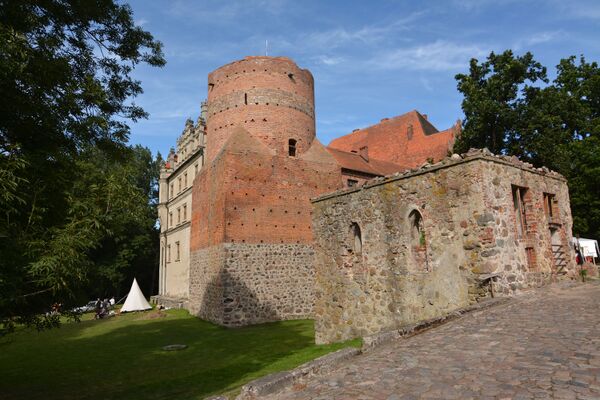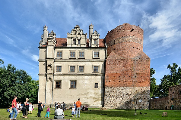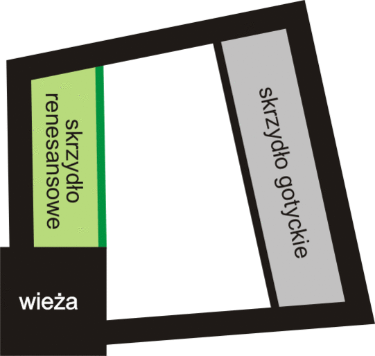Западное (ренессансное) крыло прилегает к башне с юга и имеет близкую к ней ширину (около 10 м). Это трехэтажное здание с подземельем. На этажах есть по одной большой зале. Зала первого этажа имеет цилиндрический свод с люнетами и используется в гастрономических целях. Зала на втором этаже имеет железобетонную потолок, облицованный древесиной, имитирующей ее довоенный вид. Эта зала посвящена истории замка; здесь также есть ренессансный камин и данскер в форме эркера. В зале на третьем этаже представлена выставка исторических костюмов, связанных с придворной культурой. Выставка создана благодаря финансовой поддержке Европейского Союза. На чердаке есть несколько комнат, разделенных фахверковыми стенами.