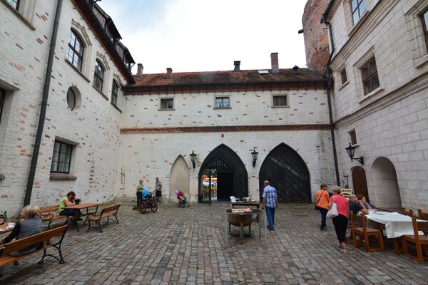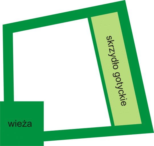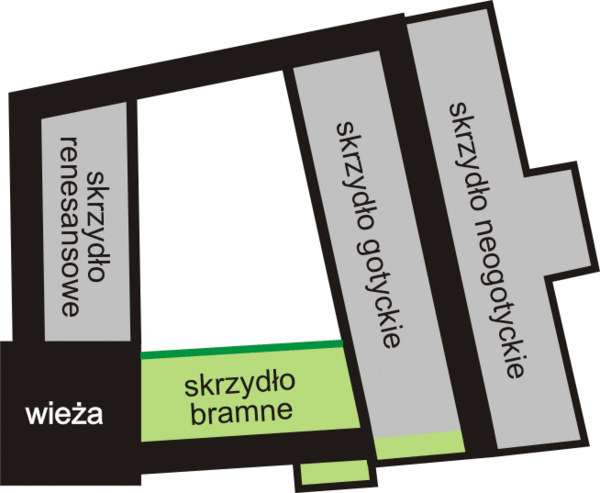 Вход в готическое крыло сперва находился посередине фасада со стороны двора (сейчас он расположен в надбрамном крыле). Нынешний вид фасада со стороны двора был реализован во время ремонтно-модернизационных работ в 1902 году на основе иконографических источников и внешнего вида сохранившейся верхней северной части[2]. Во время ремонта в 1935—1940 годах крыло было слегка вытянуто с южной стороны и была выстроена новая щипцевая стена. Щипцовая стена с северной стороны сохранила позднеготические элементы (включая окно, увенчанное аркой)[2].