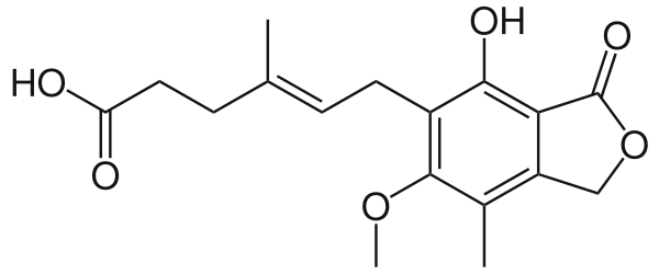 В 1893—1896 годах итальянский врач Бартоломео Госио выделил с заплесневелых зёрен кукурузы грибок Penicillium brevicompactum (назвав его P. glaucum) и продемонстрировал подавление развития Bacillus anthracis неизвестным метаболитом этого грибка. В 1913 году Олсберг и Блэк повторно получили это вещество из культуры штамма, определённого как P. stoloniferum, и назвали его микофеноловой кислотой. Микофеноловая кислота — первое антибиотическое вещество грибкового происхождения, полученное в кристаллическом виде. Обладает антибактериальным, противогрибковым, противовирусным, противоопухолевым, противопсориазным, иммунодепрессантным действием, однако распространения в качестве антибиотика не получила, поскольку токсична. 2-Морфолиноэтиловый эфир микофеноловой кислоты (более легко усвояемое пролекарство, в организме гидролизующееся до микофеноловой кислоты) используется в качестве иммунодепрессанта при пересадке почек, сердца, печени. Это вещество также выделяется видом P. echinulatum[21][28].