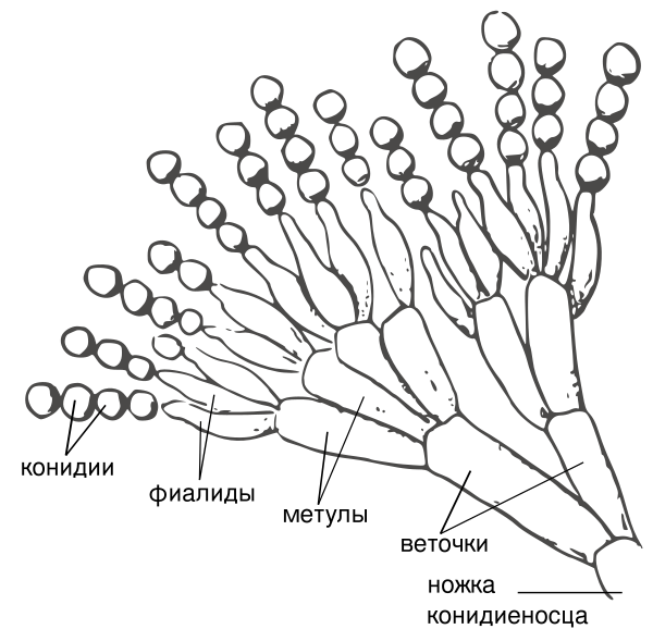 Конидиеносцы образуются на недифференцированных гифах субстратного, поверхностного или воздушного мицелия, 2—5 мкм толщиной, тонкостенные, у некоторых видов с верхушечным вздутием, обычно гиалиновые, редко коричневые. Конидиеносцы септированные, на конце несут так называемую кисточку (лат. penicillus) — мутовку фиалид (одноярусная кисточка) или мутовку метул, несущих по мутовке конидиогенных клеток каждая (двухъярусная кисточка). Сам конидиеносец может дополнительно ветвиться, в результате образуются трёх- и четырёхъярусные (иногда и с большим числом ярусов) кисточки. У некоторых видов конидиеносцы заканчиваются одиночными конидиогенными клетками. Конидиогенные клетки — фиалиды (иногда называемые стеригмами) — фляговидные, обычно не превышают 15 мкм в длину. Конидии (фиалоконидии) одноклеточные, у большинства видов 2—5 мкм в наибольшем измерении, образуются базипетально на суженных в шейку верхушках фиалид. Цепочки конидий могут быстро распадаться либо длительное время сохраняться, также могут переплетаться между собой либо оставаться параллельными, образуя колонки. Конидии в массе различных оттенков зелёного, реже белые, коричневые, оливковые[4].