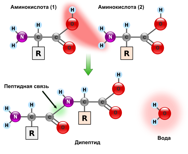 Из двух аминокислот (1) и (2) образуется дипептид (цепочка из двух аминокислот) и молекула воды. По этой же схеме рибосома генерирует и более длинные цепочки из аминокислот: полипептиды и белки. Разные аминокислоты, которые являются «строительными блоками» для белка, отличаются радикалом R.