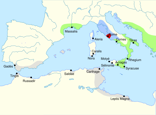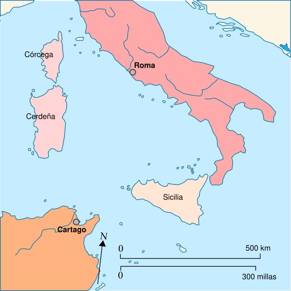 Рим и Карфаген оставались в добрососедских отношениях вплоть до 264 года до н. э. Между ними существовали различные союзнические договора, а также активная торговля[18]. Межгосударственные отношения начались между ними достаточно давно: согласно Полибию, уже в 509 году до н. э. Карфаген и Рим заключили договор, в основном закреплявший торговые узы. В дальнейшем между государствами продолжали заключаться договоры в основном на ту же тему, однако помимо этого разграничивавшие сферы влияния. Согласно этим документам, Рим в своей экспансии ограничивался «Мысом Справедливости» и городом, обычно отождествляемым с Новым Карфагеном, а также не мог основывать поселения на Сардинии и в Африке и торговать там с кем-то, кроме Карфагена[19].