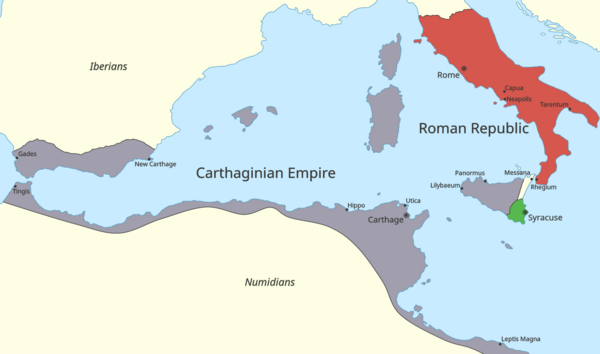 К моменту начала боевых действий и Рим, и Карфаген были уже многолетними устоявшимися государствами, основанными давно и крепко стоявшими на своих землях. Их столицы, Рим и Карфаген, первые поселенцы основали с разницей в примерно 50 лет. Карфаген был основан около 814 года до н. э., а Рим — около 753 года до н. э. После своего возникновения римская держава вела агрессивную экспансию в Италии, покоряя другие государства и народы Апеннинского полуострова, которая завершилась в 270 году до н. э. покорением Регия на юге Италии, на Мессинском проливе. Экспансия Карфагена была иной, поскольку он создал морскую державу, которая представляла собой сеть союзных и покорённых городов по всему Западному Средиземноморью, включая остров Сицилия, на западе которого находились их города Панорм, Солунтум и другие. Восточную часть острова населяли древние греки, нередко враждовавшие с Карфагеном, покоряемые им и снова освобождавшиеся из под иноземного ига[17].