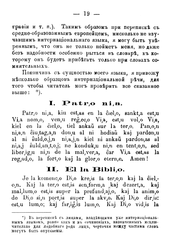- Кроме заявления на обложке («Чтобы язык был всемирным, недостаточно назвать его таковым») в Первой книге имеется ещё одно необычное заявление: «Интернациональный язык, подобно всякому национальному, составляет достояние общественное, и от всяких личных прав на него автор навсегда отказывается» («Интернаціональный языкъ, подобно всякому національному, составляетъ достояніе общественное, и отъ всякихъ личныхъ правъ на него авторъ на всегда отказывается»). Эта реплика опять же полемизирует с И. М. Шлейером (создателем волапюка), который рассматривал волапюк своей собственностью и крайне авторитарно относился к критике и попыткам реформировать его язык.