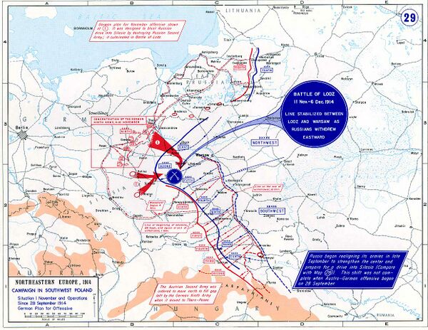 В августе и сентябре 1914 года Российские войска победили в битве при Гумбиннене, но проиграли в битве на Мазурских озёрах. Успех сопутствовал русским войскам в Галицийском и Варшавско-Ивангородском сражениях[30]. Осада Перемышля так же увенчалась успехом для России. К маю немцы начали наступление на Горлице и Тарнув, которое вынудило отступить Российские войска[31]. К 5 августа Варшава была оккупирована немцами. Их наступление закончилось в сентябре 1915 года, когда вся Польша и часть Минской губернии были оккупированы.