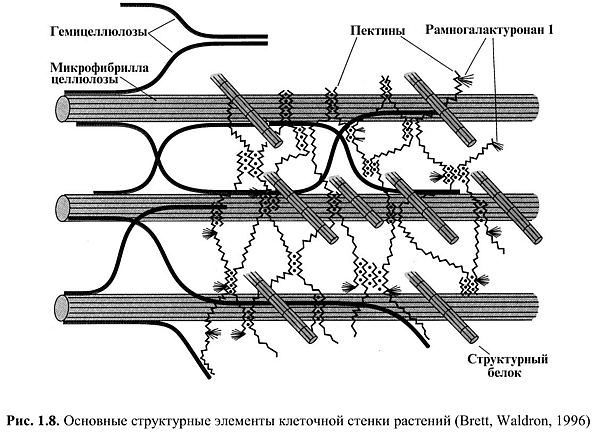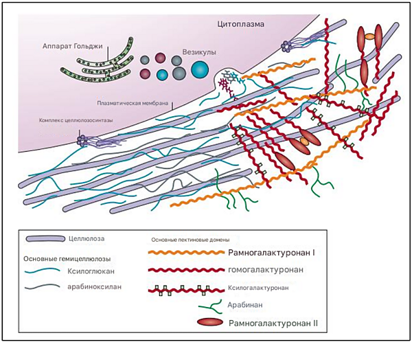 Первичная клеточная стенка высших растений состоит из трёх взаимодействующих, но структурно независимых трёхмерных сетей биополимеров. Основная сеть состоит из фибрилл целлюлозы и гемицеллюлоз (или — из сшивочных гликанов). Вторая сеть состоит из пектиновых веществ. Третья сеть представлена, как правило, структурными белками клеточной стенки[6]. Микрофибриллы целлюлозы напрямую сшиты с гемицеллюлозами и встроены в матрикс, состоящий главным образом из пектинов и небольшого количества структурных белков.