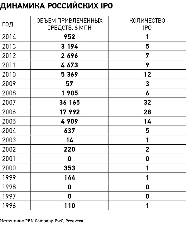 В 2014 году IPO провела сеть гипермаркетов «Лента» на Лондонской бирже, сумев привлечь 952 млн долларов[20].