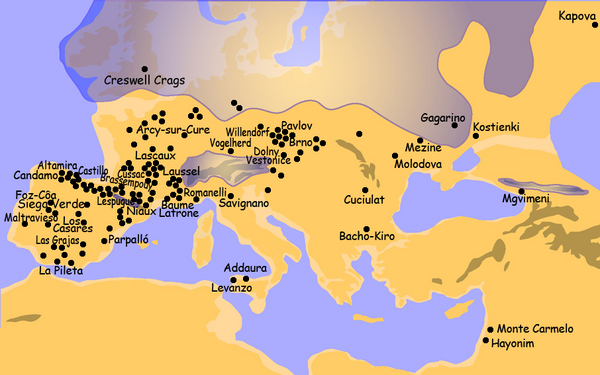 - Азия: пещеры близ Мароса на Сулавеси и южнокорейская пещера Туробон содержат изображения, созданные ок. 40 тыс. лет назад[21][22];
