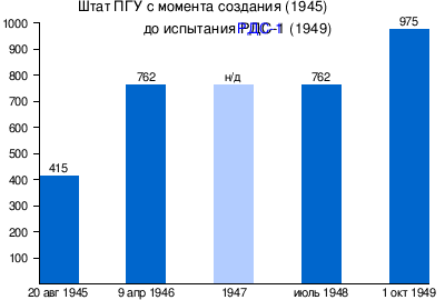 ПГУ с момента создания планировалось как серьёзное ведомство, его структура с момента создания включала в себя секретариат, восемь управлений и три отдела, напрямую подчинявшиеся руководству управления. Штат управления с момента создания (20 августа 1945 года) составил 415 человек, но укомплектовать удалось не все вакансии[5]. Позже, 30 ноября 1945 года, в качестве дополнительной нагрузки на структуру ПГУ стало размещение и обслуживание Инженерно-технического совета Специального комитета. На том же заседании было принято решение об организации ГСПИ-11 — головного разработчика отрасли[6].