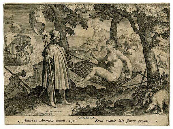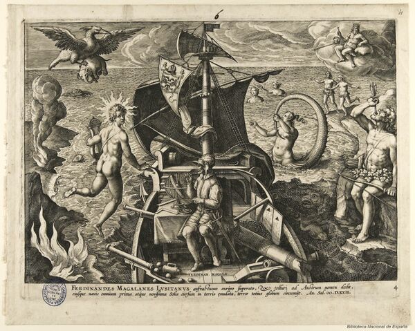 По мнению Ф. Фернандеса-Арместо, формирование и закрепление в общественном сознании Западной Европы мифа о подвиге Магеллана началось во второй половине XVI века, особенно после напечатания Рамузио отчёта Пигафетты (1550 год) и выхода в свет труда Антонио де Эррера-и-Тордесильяса, провозгласившего экспедицию «самым замечательным событием, которое человек когда-либо видел от сотворения мира». Гравюры Страдануса, издаваемые мастерской де Бри массовыми тиражами, закрепили образ Магеллана как рыцаря, ассоциируемого с упорядочением хаоса, ибо на известной гравюре он изображён с русалкой и армиллярной сферой. Традиция аллегорических изображений Магеллана не прерывалась весь XVII век, его символические портреты помещались как в описаниях путешествий, так и атласах мира, печатаемых в Нидерландах и Франции[221].