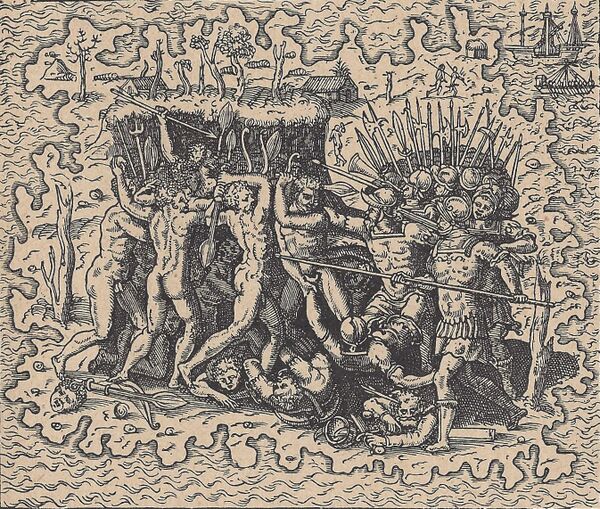 Туземцы продолжали преследование, и поднимая с земли по четыре-шесть раз одно и то же копьё, метали их в нас вновь и вновь. Узнав капитана, на него накинулось такое множество людей, что дважды с его головы сбили каску, но всё же он продолжал стойко держаться, как и подобает славному рыцарю, вместе с другими, рядом с ним стоящими. Так мы бились больше часа, отказываясь отступать дальше. Один индеец метнул бамбуковое копьё прямо в лицо капитана, но последний тут же убил его своим копьём, застрявшим в теле индейца. Затем, пытаясь вытащить меч, он обнажил его только до половины, так как был ранен в руку бамбуковым копьём. При виде этого на него накинулись все туземцы. Один из них ранил его в левую ногу большим тесаком, похожим на турецкий палаш, но ещё более широким. Капитан упал лицом вниз, и тут же его закидали железными и бамбуковыми копьями и начали наносить удары тесаками до тех пор, пока не погубили наше зерцало, наш свет, нашу отраду и нашего истинного вождя[160].